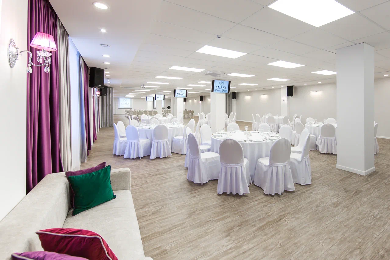 Банкетный зал в светлых тонах с атмосферой уюта и элегантности площадью 390 кв.м. Освещается мягким светом со светодиодным прожектором. Вместимость: до 200 человек.