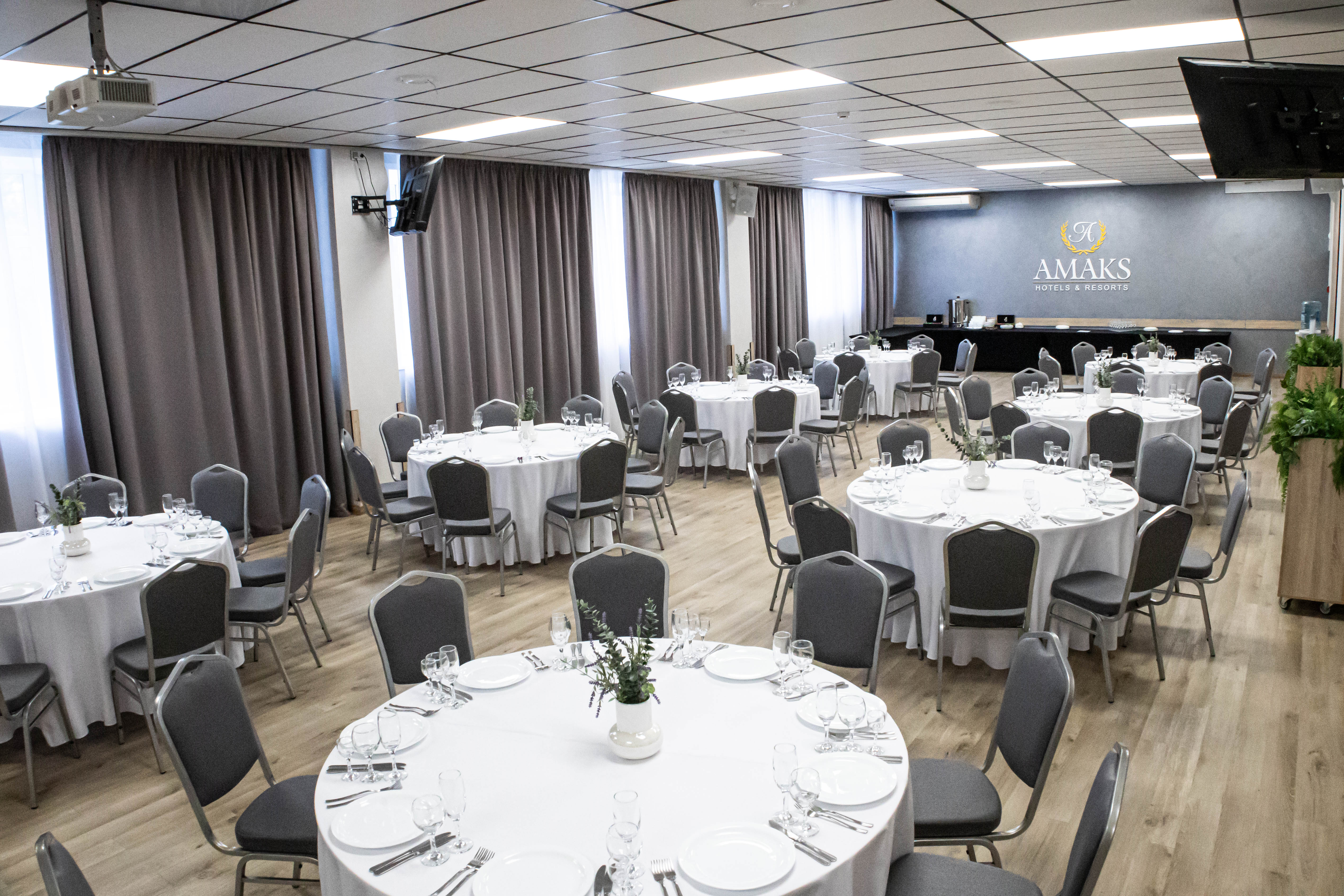 Банкетный зал в светлых тонах с атмосферой уюта и элегантности. Освещается мягким светом со светодиодным прожектором.